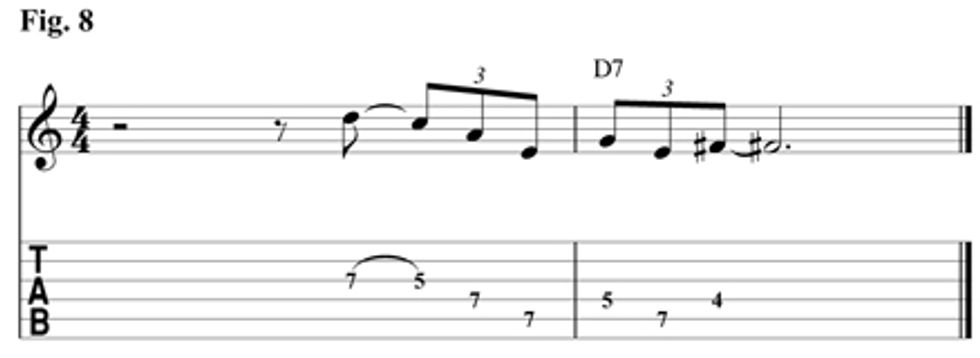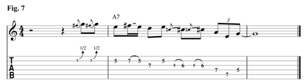 Fig. 7 again makes use of the 6th scale degree with a half-step bend. Then once again resolves to the b7th of the A7. The use of the 6th is a popular choice of blues players like Robben Ford. Download example 7 audio...