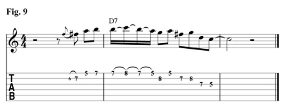 Fig. 9 utilizes the 6th of the D7 chord and then resolves to the b7th. The hammer-on and pull-offs on the 1st string between the third and fourth fingers can be hard at first, so take your time and you’ll get it. Download example 9 audio...