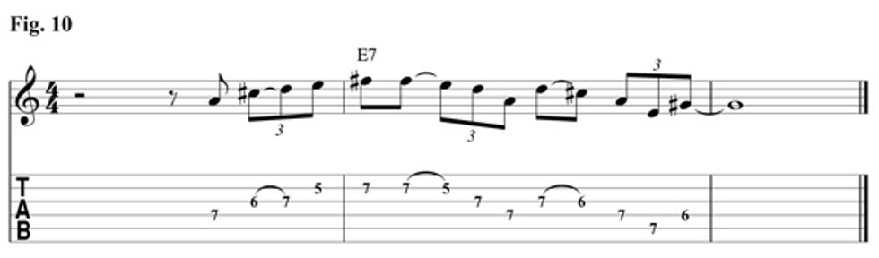 Fig. 10 uses the A Ionian scale fingering to get the E Mixolydian sound over the E7 chord. The lick starts out on the 4th scale degree and then resolves on the 3rd (G#) of the E7th chord. Download example 10 audio...