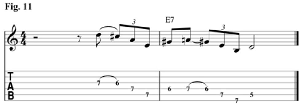 Fig. 11 is also an A Ionian scale fingering that gives us the E Mixolydian sound over E7. This lick starts on the b7th (D) of the E7. It then resolves to the D an octave lower. Download example 11 audio...