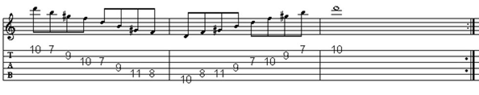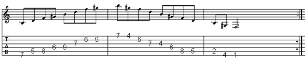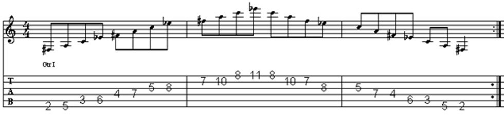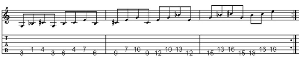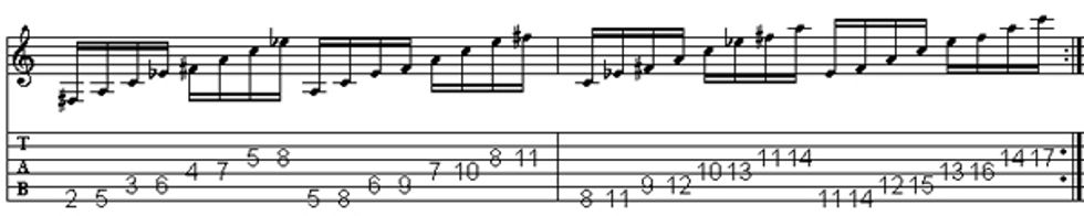 | Example 1: Here is a common, symmetrical approach to the diminished arpeggio. Notice the distances between each note is a minor 3rd or 3 half-steps. You can pick every note or hammer-on, preferably both. There is a bit of horizontal movement with the fretting hand and a whole-step jump between strings 3 and 4, making it a little more challenging to reach. Practice this ascending and descending: | |