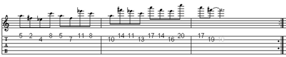 | Example 6: Again we quickly build tension in the listener by ascending, with an emphasis on the minor 3rd movement in the bass: | |