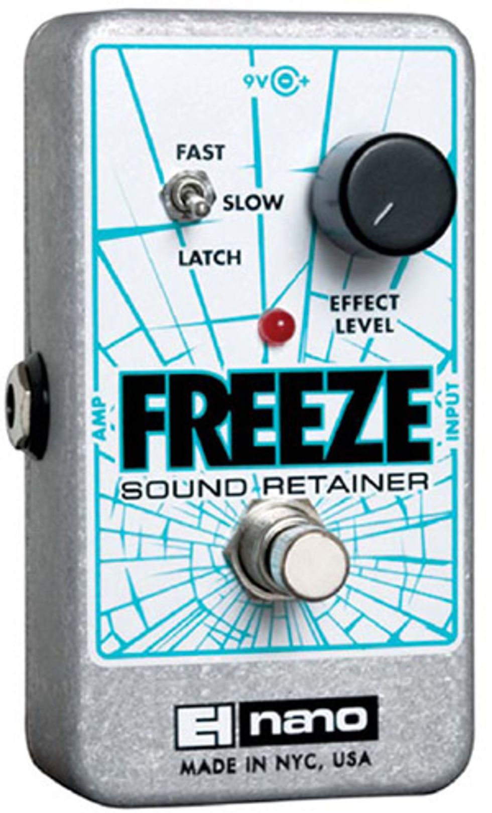 The Freeze is an intuitive, what-you-see-is-what-you-get unit. For starters, there’s a 3-position switch for selecting Fast, Slow, or Latch mode. In Fast mode, the Freeze will begin sustaining your signal the moment the footswitch is pressed and hold that sound until the footswitch is released. In Slow mode, the captured signal fades in gradually and then sustains until you release the footswitch, at which time it slowly fades to silence. Following a simple process described in the manual, you set the length of this fade by selecting one of three preset durations.