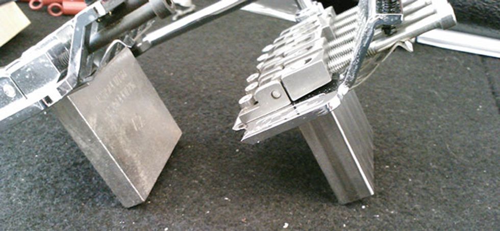 Once the guitar was properly intonated and tuned, the tones were crisp with more presence. In overdriven settings, there was a much more aggressive attack that, at times, bordered on harshness. Lowering the gain on the amp alleviated most of that problem. Still, the tone generated via the titanium block seemed brittle at extreme settings compared to the brass unit or the original. Sustain was still excellent, though in general, there was less physically perceptible resonance. Also, when reaching for the arm to vibrato chords or to do extreme pitch bends, I found the heavy-duty noiseless springs made the action of the bridge much stiffer.