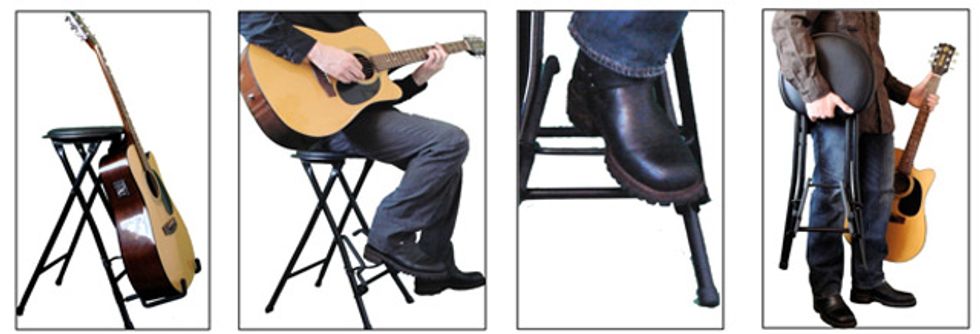 The StagePlayer2 caught our interest immediately because of its simple and useful design. It's a foldable stool with a built-in guitar stand and foot rest. Built for performing live or practicing at home, the StagePlayer2 simplifies the amount of gear you have to haul around. Here are the specs from Farley's: