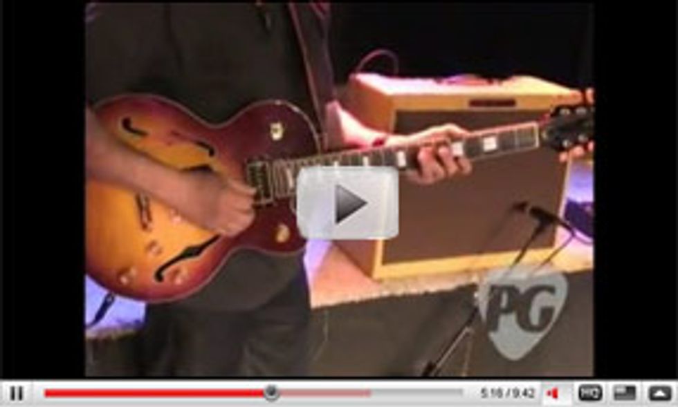 A Fender reverb tank made the sound (you guessed it) reverberant. Effect and gain pedals sounded fine but adversely affected tone purity. Humbuckers sounded very sweet and sustained with nice mid support, but without the P-90 grind.