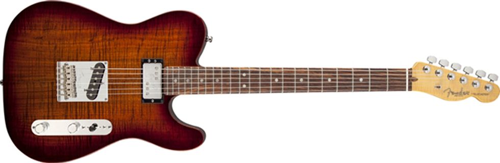 The new Fender Select Carved Top Telecaster SH offers a chambered alder body, gorgeous carved Tasmanian blackwood top and hand-stained Black Cherry Burst finish with gloss lacquer topcoat. If offers a "C"-shaped flame maple neck with satin lacquer finish and Bi-Flex truss rod system, and a compound radius rosewood fingerboard with 22 medium jumbo frets.