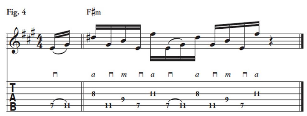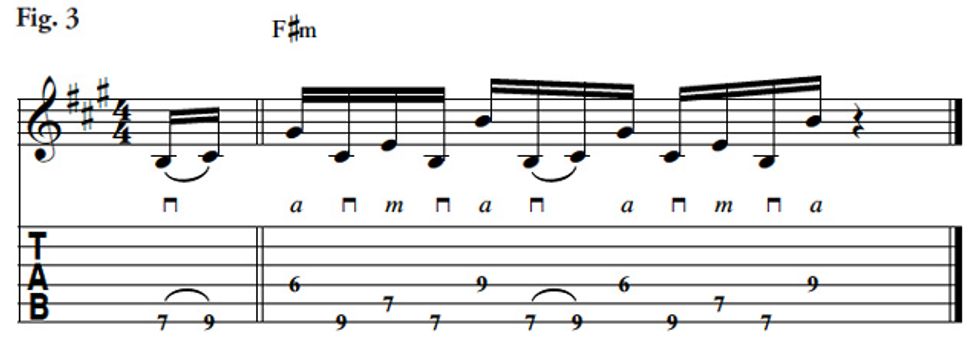 In Fig. 2 we take the same arpeggio and create a seven-note pattern that will repeat twice. In the example I have notated which finger to use for each string with a representing the ring finger and m indicating the middle finger. The missing last note gives the lick a displaced feeling, but continuing with the 16th-note rhythm adds excitement. The arpeggio is pulled apart by bouncing intervals between the b7 and the lick’s root note, and with the 5th, b3rd, and the b7 occurring an octave higher. In the audio example, I cycle the lick twice so you can hear the connection between the two seven-note patterns.