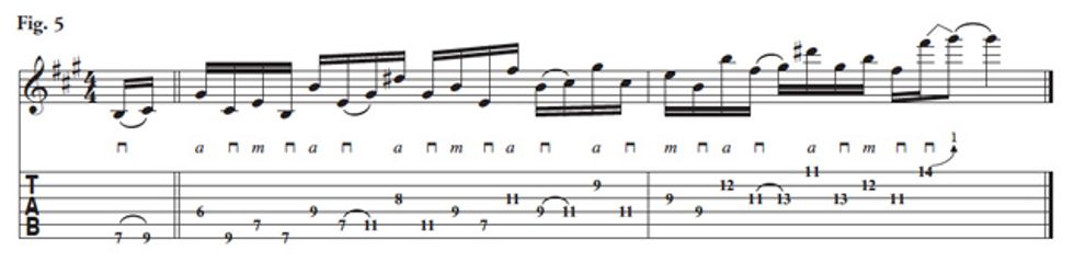 We will combine a few of these examples to create Fig. 5. We start in the 7th position and cycle through the seven-note pattern four times before ending with huge bend at the 14th fret. The chords we are implying over this example are C#m7, Emaj9, C#m7, and G#m7. Notice the wicked sound and contour of the lick. Using hybrid picking really allows me to pop those notes out. My suggestion would be to get the feeling of each example and make sure you can repeat it in tempo to feel the syncopation.