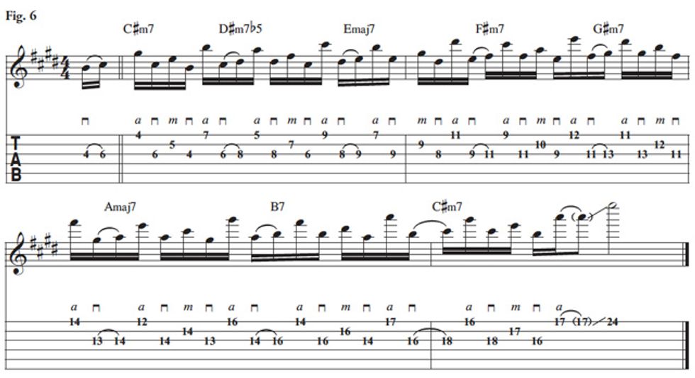 Finally, we’ll take the concept up the neck, instead of across the neck. This can be done on all string sets, but the example shown in Fig. 6 will deal with strings 1–3. We’ll start on the key’s relative minor chord, which will be C#m7, and again use the same hybrid-picking approach with these arpeggios. I find that the minor shape feels the best right out of the gate, but our fingers will adapt to the other shapes lurking around the corner.