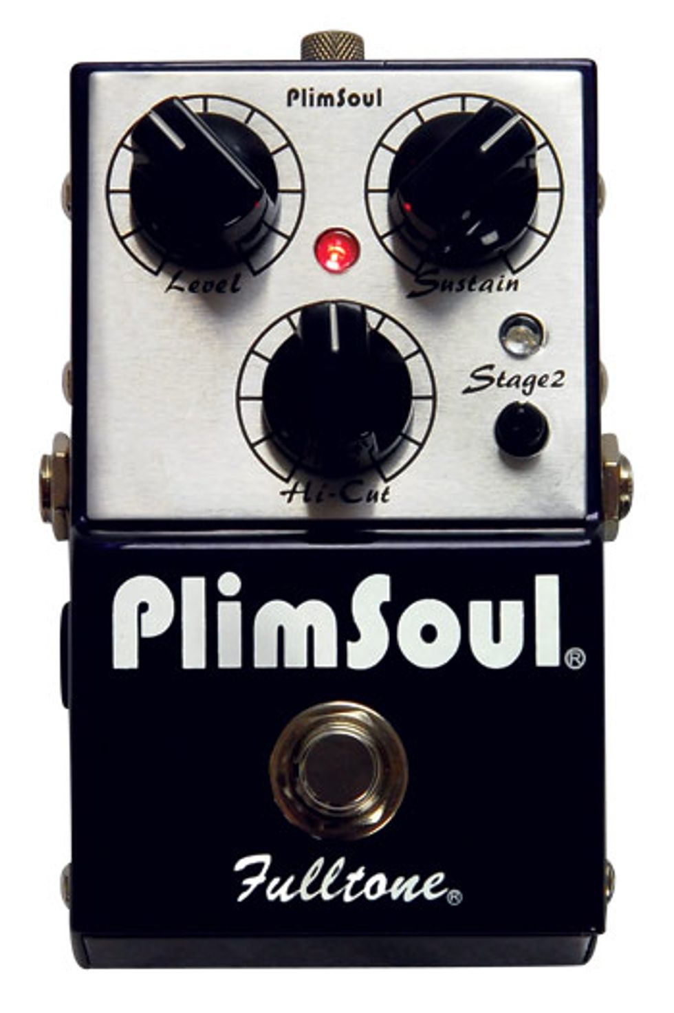 Like most Fulltone pedals, the PlimSoul is a handmade, handwired pedal with true bypass switching, and it can run on either 9 volts or 18 volts. The PlimSoul’s control set is a simple 4-knob layout: Level, Hi-Cut, Sustain, and Stage 2. Level controls the signal output, Sustain controls the amount of distortion in Stage 1 only, Hi-Cut rolls off high frequencies, and the smaller Stage 2 knob controls the second stage of distortion and allows you to blend in hard clipping with soft clipping. A second Stage 2 LED indicates how much hard clipping is being mixed into the signal by glowing brighter or dimmer.
