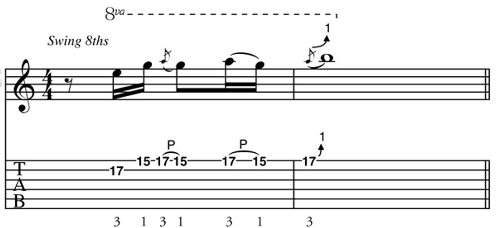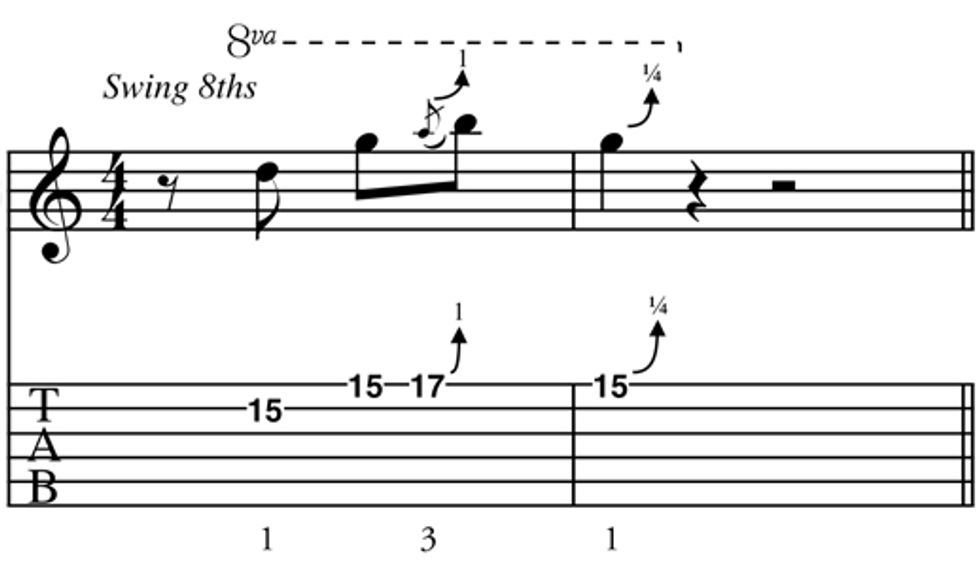 Albert Collins has a very percussive style. The following licks are meant to be played with an aggressive attitude. You should play staccato, meaning the notes are sharp and separated. To get the best tone for these, use your treble pickup (closest to the bridge) and dig in with your pick. This will give you the crisp, aggressive, high-end sound that is one of Albert’s trademarks.