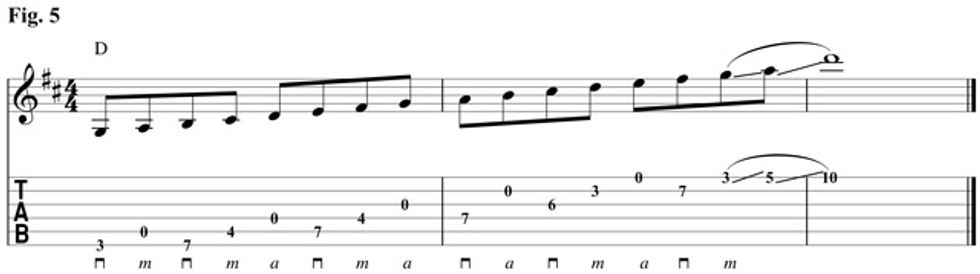 Fig. 5 is an example of an ascending D major scale where I use my pick, middle, and ring fingers. This one sounds beautiful on acoustic. I actually used this very same scale on my record to end a song called “Peach Pie.” When you play this lick, make sure to keep all the strings ringing as much as possible. The goal is to make it almost sound like a piano player running up a scale with the sustain pedal on.