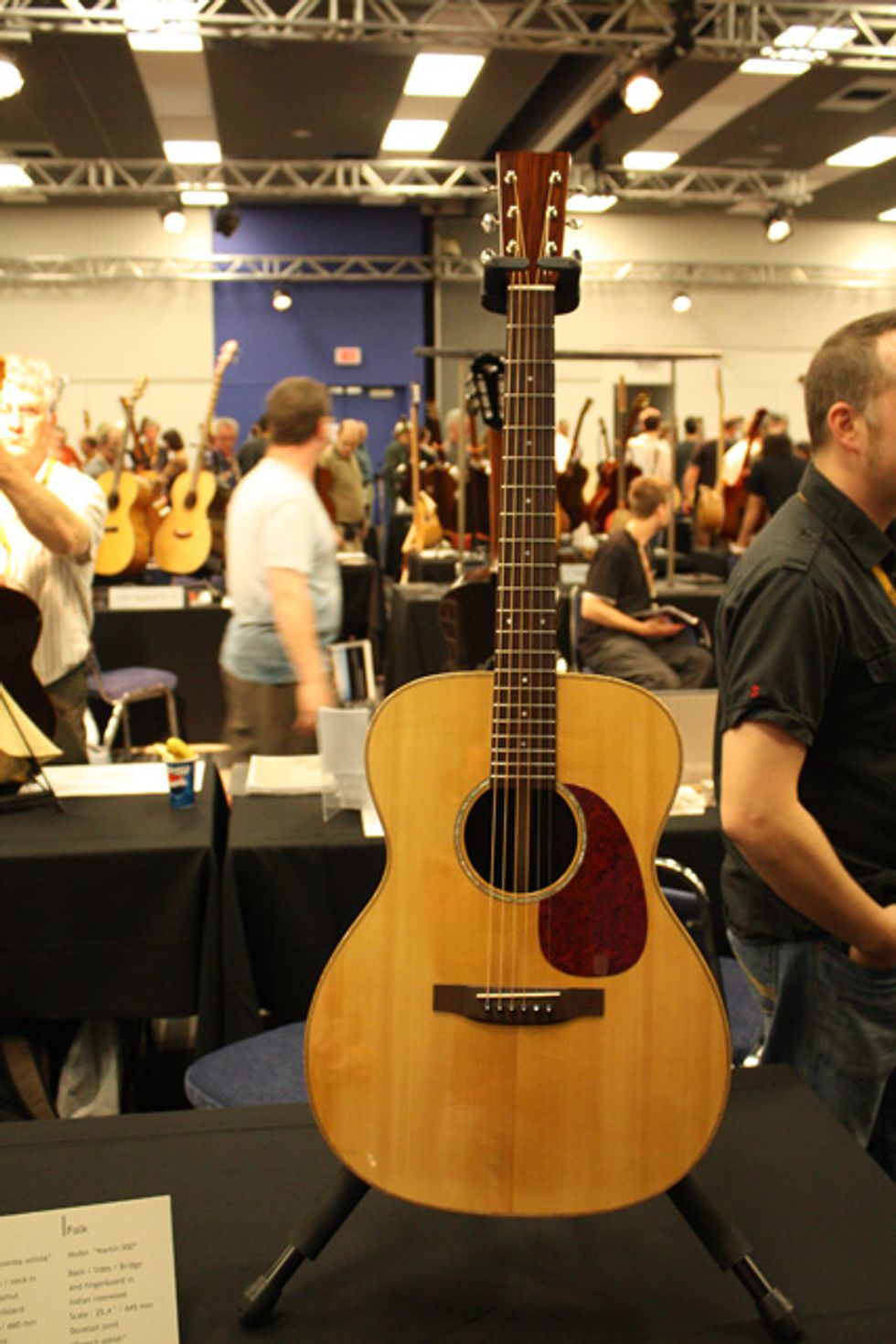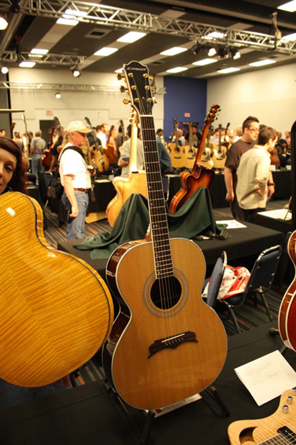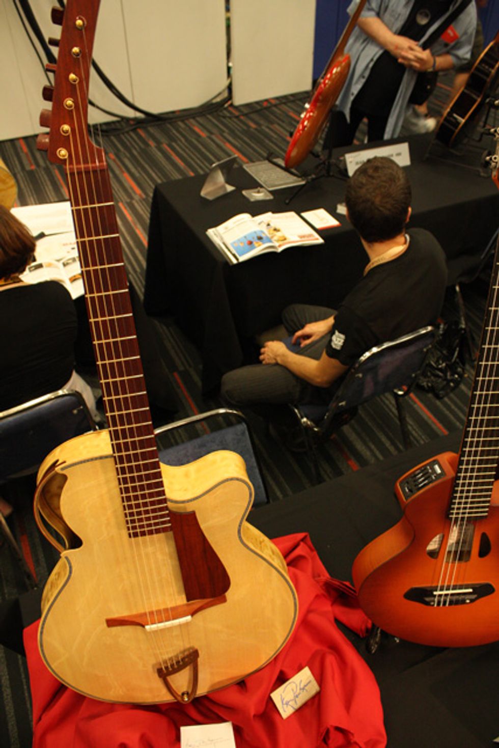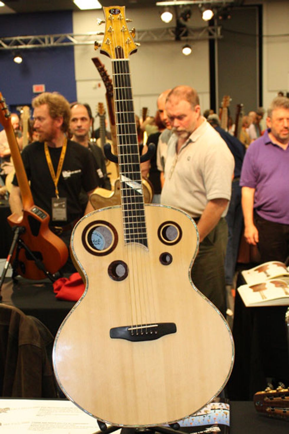 Kathy Wingert of Wingert Guitars keeps production low with fewer than 15 instruments built per year. She exhibited an E cutaway model and a harp guitar at the show. ![]() |