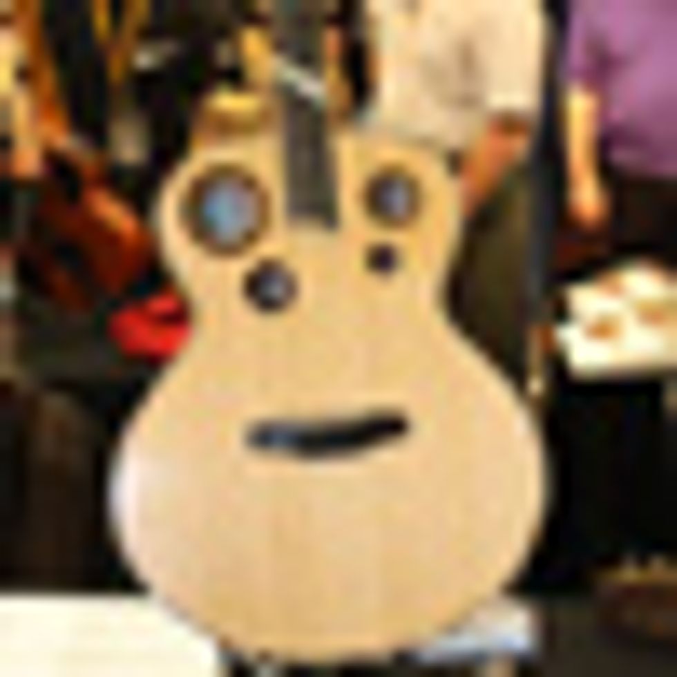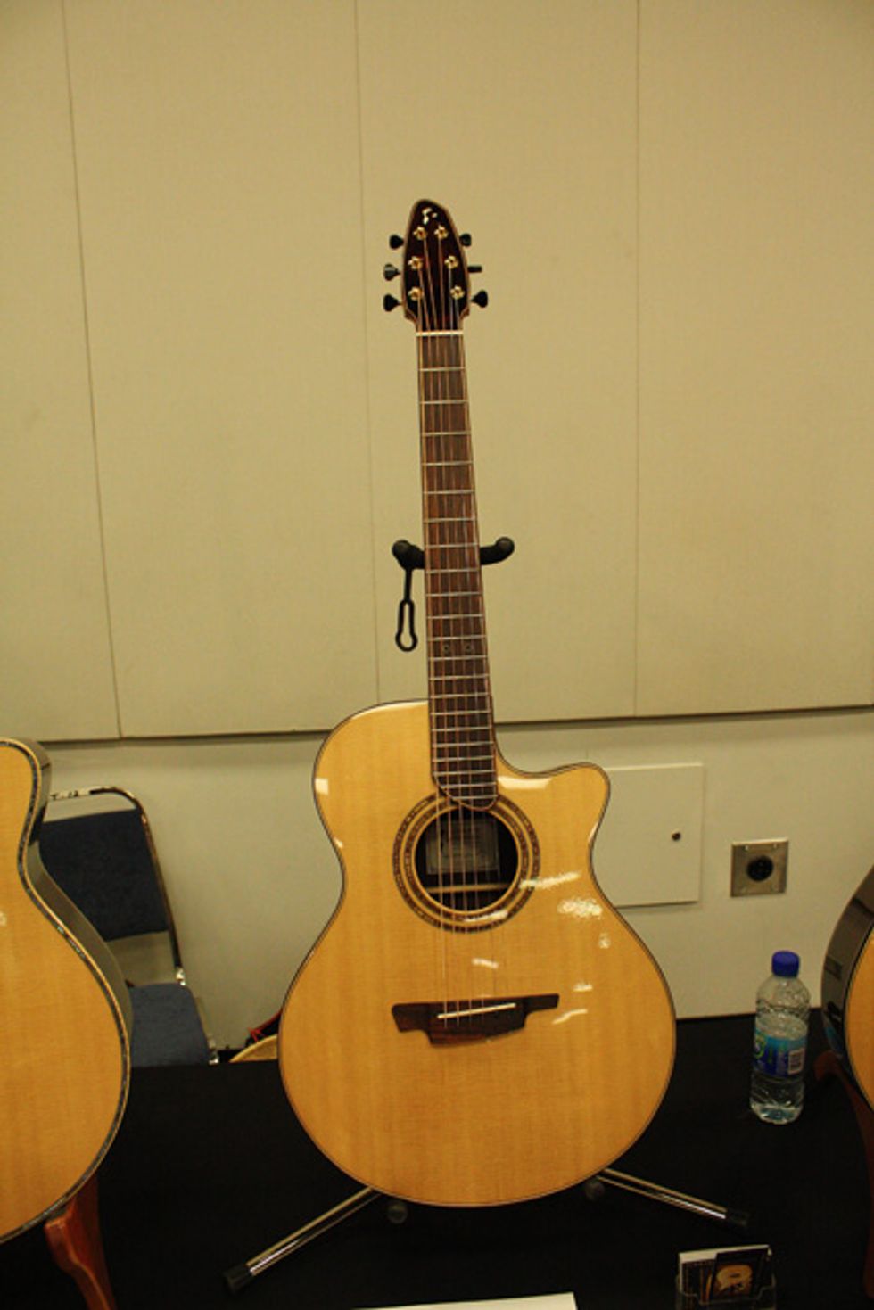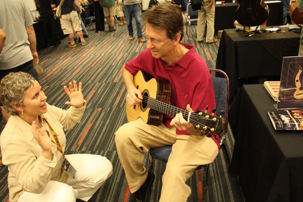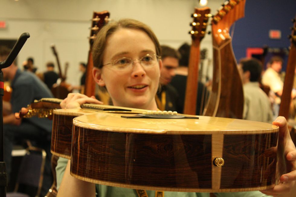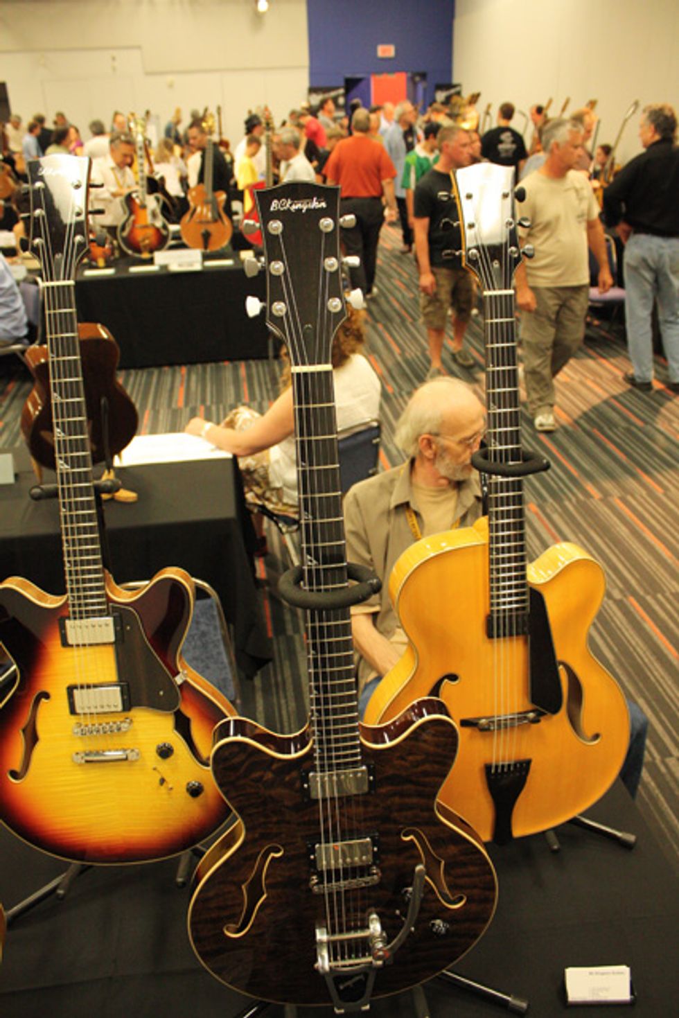 Kathy Wingert of Wingert Guitars keeps production low with fewer than 15 instruments built per year. She exhibited an E cutaway model and a harp guitar at the show. ![]() |