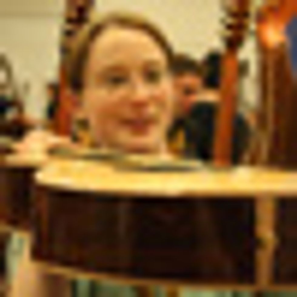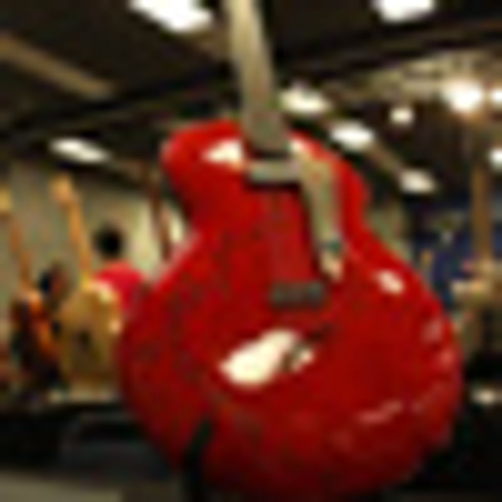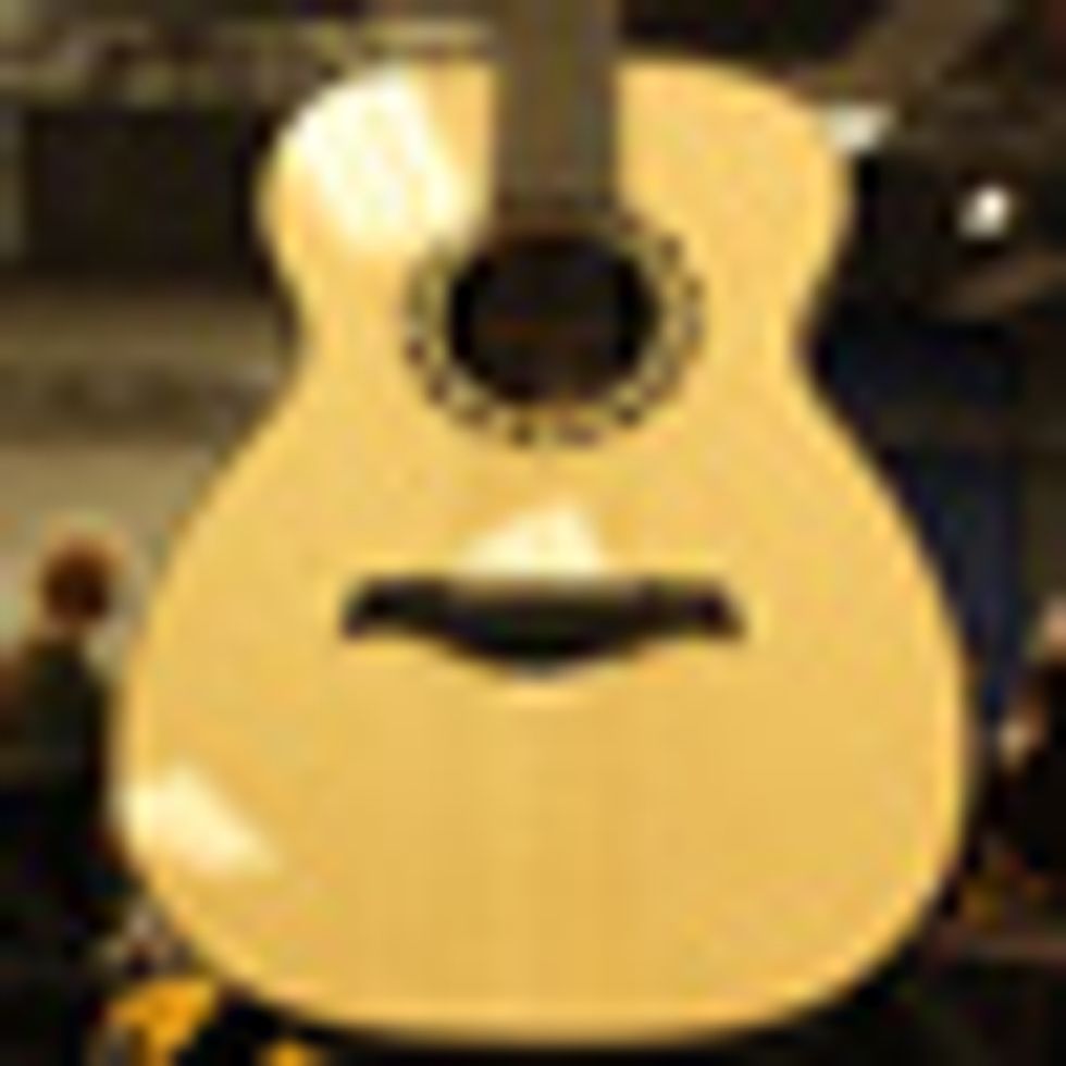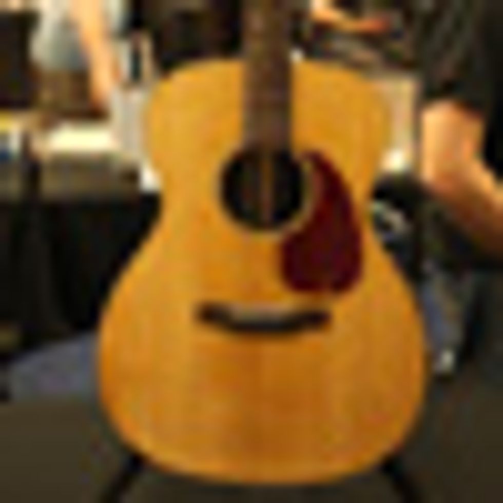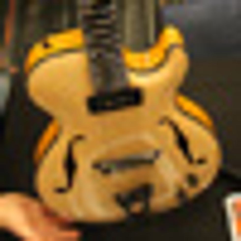 Kathy Wingert of Wingert Guitars keeps production low with fewer than 15 instruments built per year. She exhibited an E cutaway model and a harp guitar at the show. ![]() |