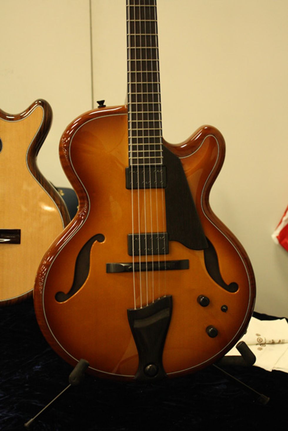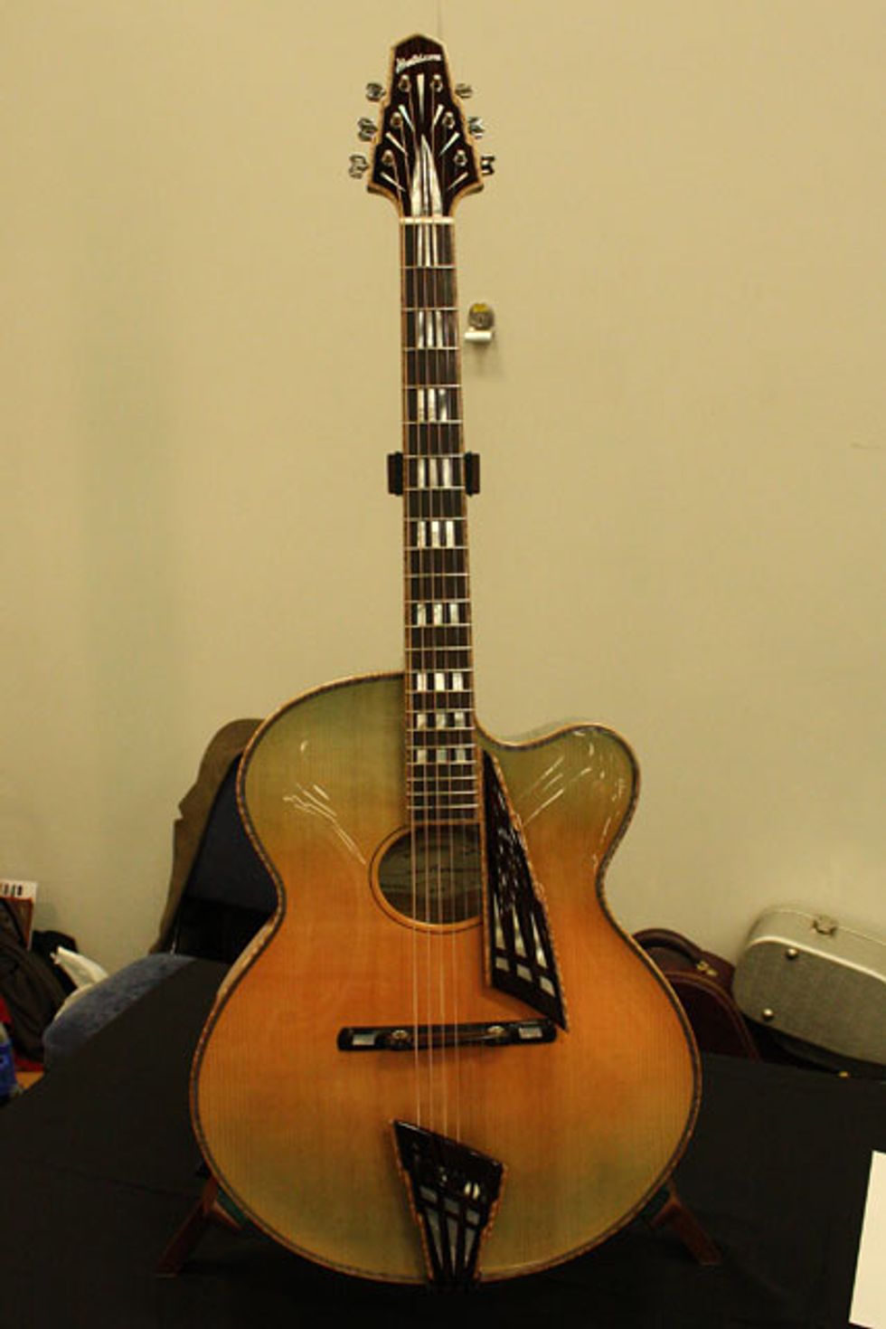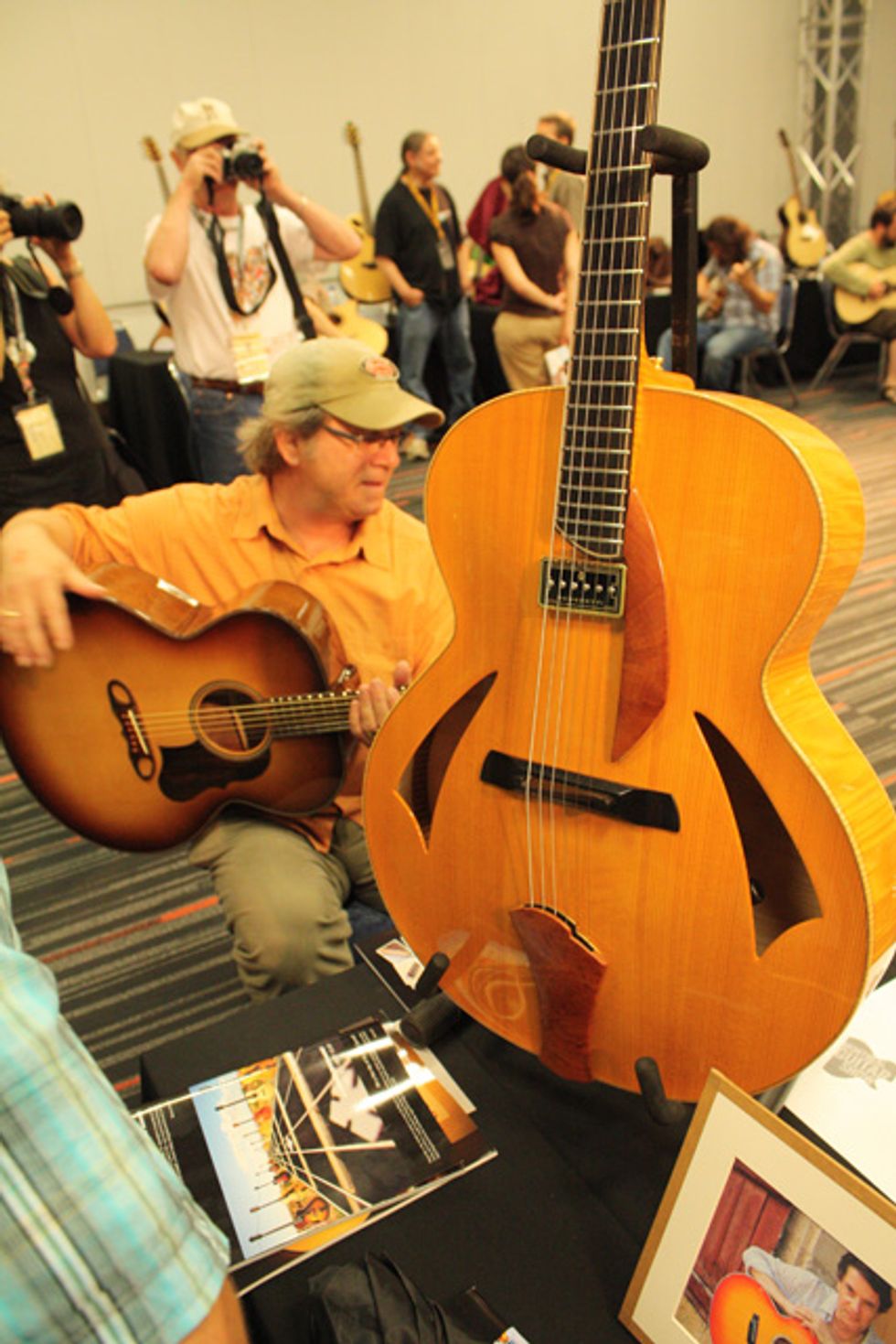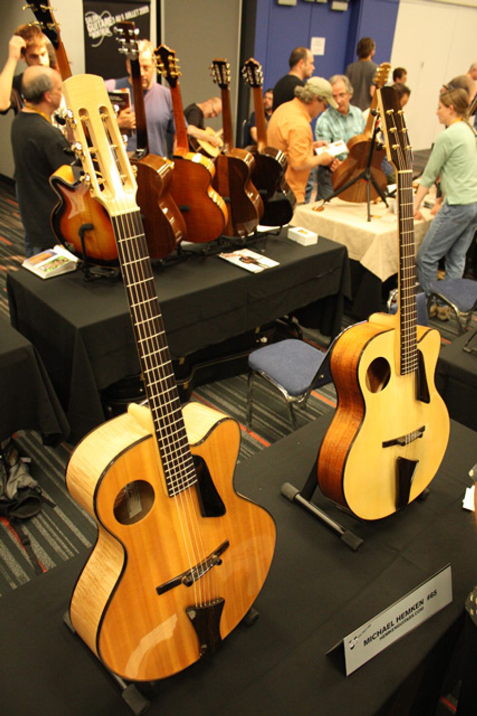 Michael Hemken of Hemken Guitars has been making acoustic instruments since 1976. He specializes in unique archtop designs. Two archtops were on display at the show.