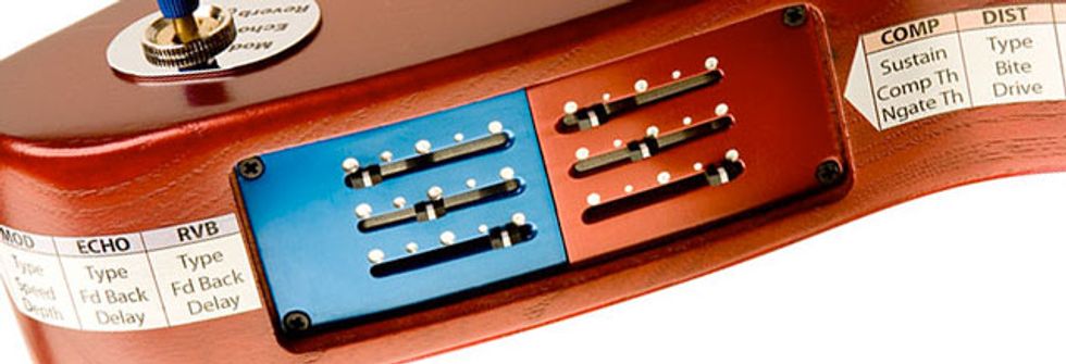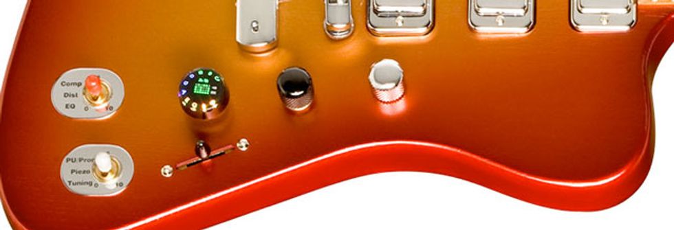 The Firebird X electronics control the guitar's built-in effects and include an 11-position Gear Shift Knob rotary knob, effects faders for Modulation/Echo/Reverb (blue) and Compression/Distortion/EQ (red), and three three-position toggles with wet/dry blend: Modulation/Reverb/Echoplex (blue), Compression/Distortion/EQ (red), Pickup programming/Piezo/Tuning (silver). The guitar comes with an accessory pack unique to its electronics including a Bluetooth number controller pedal, Bluetooth continuous pedal, and battery power converter for the rechargeable Lithium Ion battery. The guitar also ships with a unique FBX case and Ableton Live 8 and Guitar Rig 4 Pro.