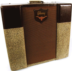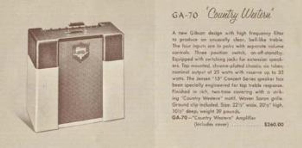 To get those kinds of sounds, guitars gotta have amps, of course—and not just any old amps. To twang, you need the right unit. In the mid-1950s, Leo Fender and his tweeds all but dominated the market in terms of treble response. Most of the country, rock, and rockabilly players were using Fender Twin, Bassman, or Pro amps. Gibson, seeing the possibilities of the niche, responded with a new amp that was a significant departure from the smooth-sounding brown boxes it had been producing since the end of World War II. That amp was the GA-70 Country Western, and it was produced between 1955 and 1958.