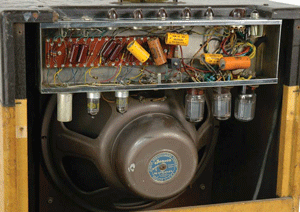 The 1957–58 version of the GA-70 was a totally different animal—and it was possibly the best, most influential (albeit indirectly) amp Gibson ever made. Its name was changed to the “Country Western,” and the new GA-70 looked almost the same as the first series, despite the fact that it had a completely redesigned circuit. It used two slightly more robust 5881 power tubes and a cathode phase inverter, and they gave it more headroom and a wider dynamic range than the ’56 version. The addition of a power choke helped keep the current stable and also contributed to the increased headroom. The new GA-70 also had a five-knob control layout with a tone stack of Bass, Treble, and Fidelity controls along with the two Volume controls. Significantly, this tone stack was copied almost exactly by Vox for the classic AC30 design—right down to a “mistake” in the fidelity control. For some reason, on the GA-70 the treble wipers were wired 180 degrees in reverse, with the result being less treble as you turned the control clockwise. Making the best of this anomaly, Vox would come to call this a “Cut” control.