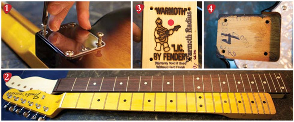 Prior to installing a new neck, I look it over and take note of all its features. For example, our maple, 28 5/8"-scale Warmoth neck had a rosewood fretboard. Warmoth offers many sizes of fretwire, and the owner had opted for 6230 vintage-style frets. He also specified a satin nitrocellulose finish.