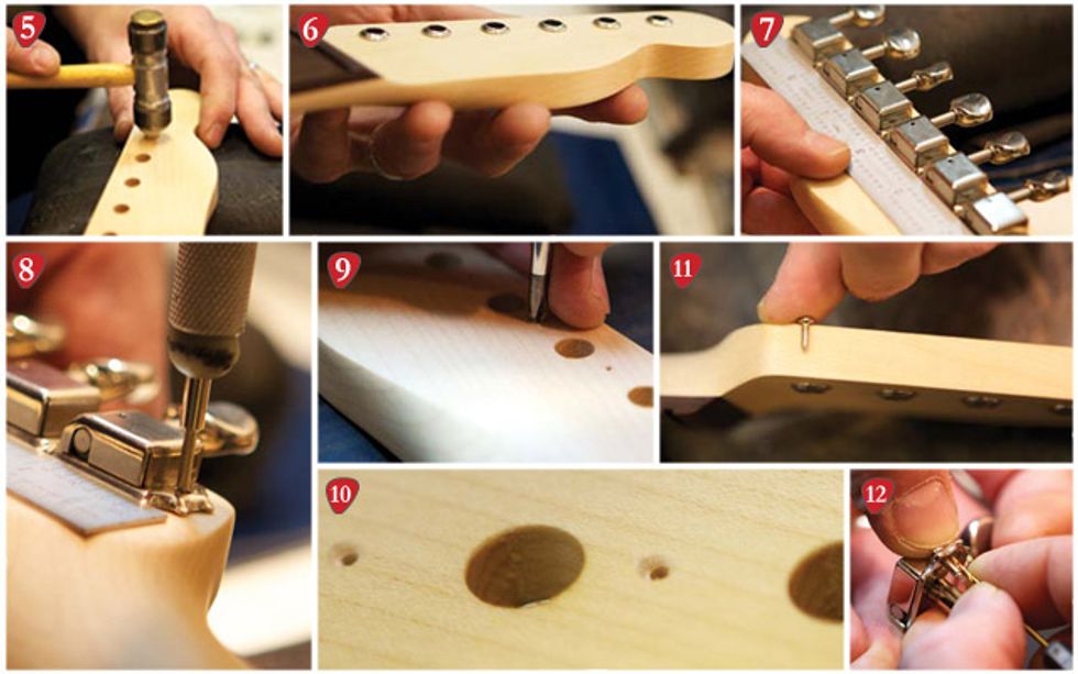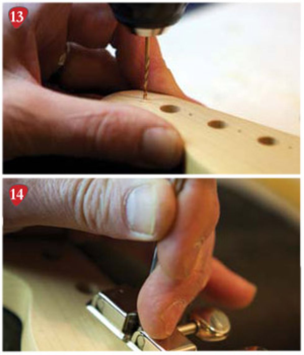 13. Drill slowly and carefully into the tunerscrew pilot holes. I’ve used a red Sharpie to mark maximum drilling depth. 14. When installing the tuner screws, be sure your screwdriver is the correct size so its tip doesn’t butcher the screw heads or slip off and hit the headstock.
