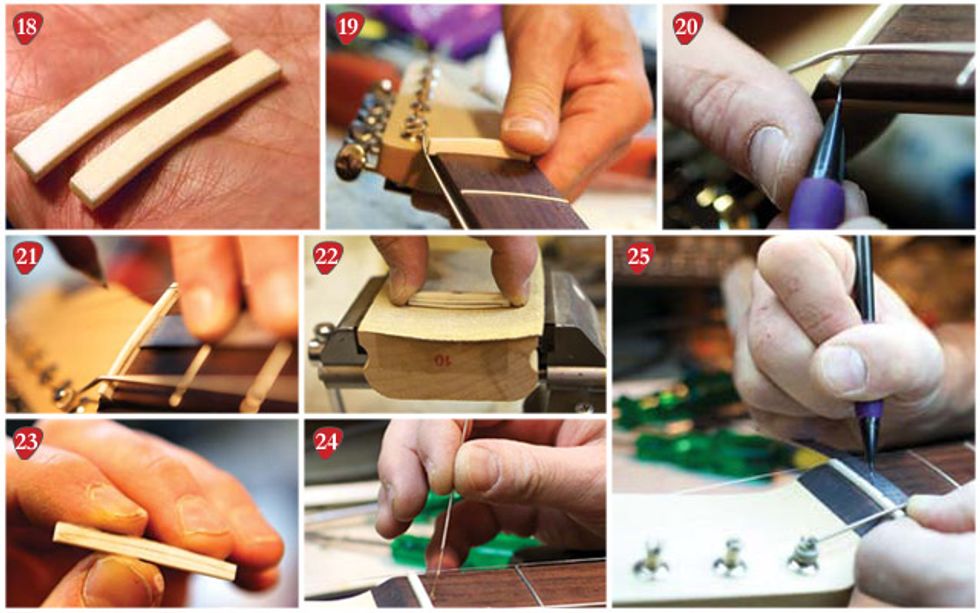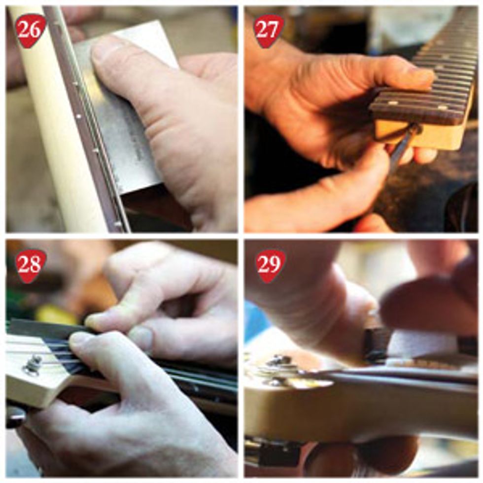 26. Measuring neck relief after the strings are tuned to pitch. 27. To adjust a vintage-style truss rod, you need to remove the neck. 28. When cutting nut slots, tilt your file down toward the headstock. 29. Using a radiused block to sand down the top of the nut.