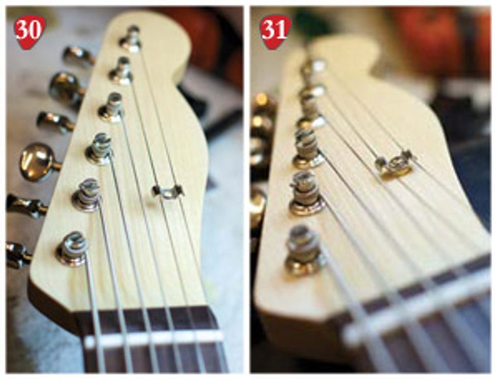 - Set string tree height. String trees only need to apply enough downward pressure to keep the high strings firmly in their slots as they stretch back toward the tuners. Stand-offs—washer-like cylinders that fit between the tree and the headstock—of different heights allow you to precisely adjust a tree’s downward pressure. To get the height I wanted, I clipped a brass ball-end from a bass string in half and use this as a stand-off (Photo 31).