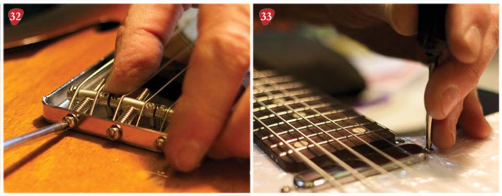 - Adjust intonation (Photo 33). This final part of the setup process involves moving the saddles either toward or away from the neck. With an electronic tuner, bring each string to pitch. Starting with the 1st string, play the 12th-fret harmonic and then fret the same note. If the fretted note is sharp, move the saddle away from the neck. Conversely, if the fretted note is flat, move the saddle toward the neck. Make small adjustments and retune each time you do. Repeat this process until the 12th-fret harmonics and fretted notes match on all six strings.