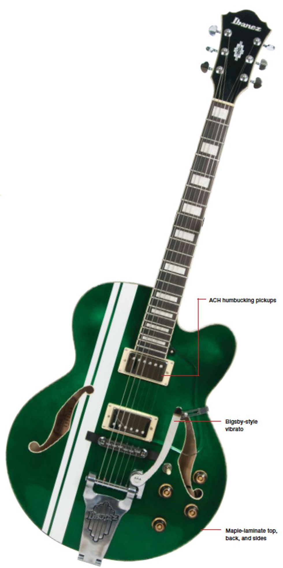 For instance, the flagship Artcore model—the AF105—is a Gibson L-5CES– inspired jazz box for under a grand, and the ES-335–style AS73 sells for less than 500 bucks. This year, several new Gretsch-inspired Artcore models made their debut, including the AFS80T reviewed here. This fully hollow, single-cutaway thinline sports twin humbucking pickups and a Bigsby-type tailpiece, and will only set you back about 500 bucks on the street.