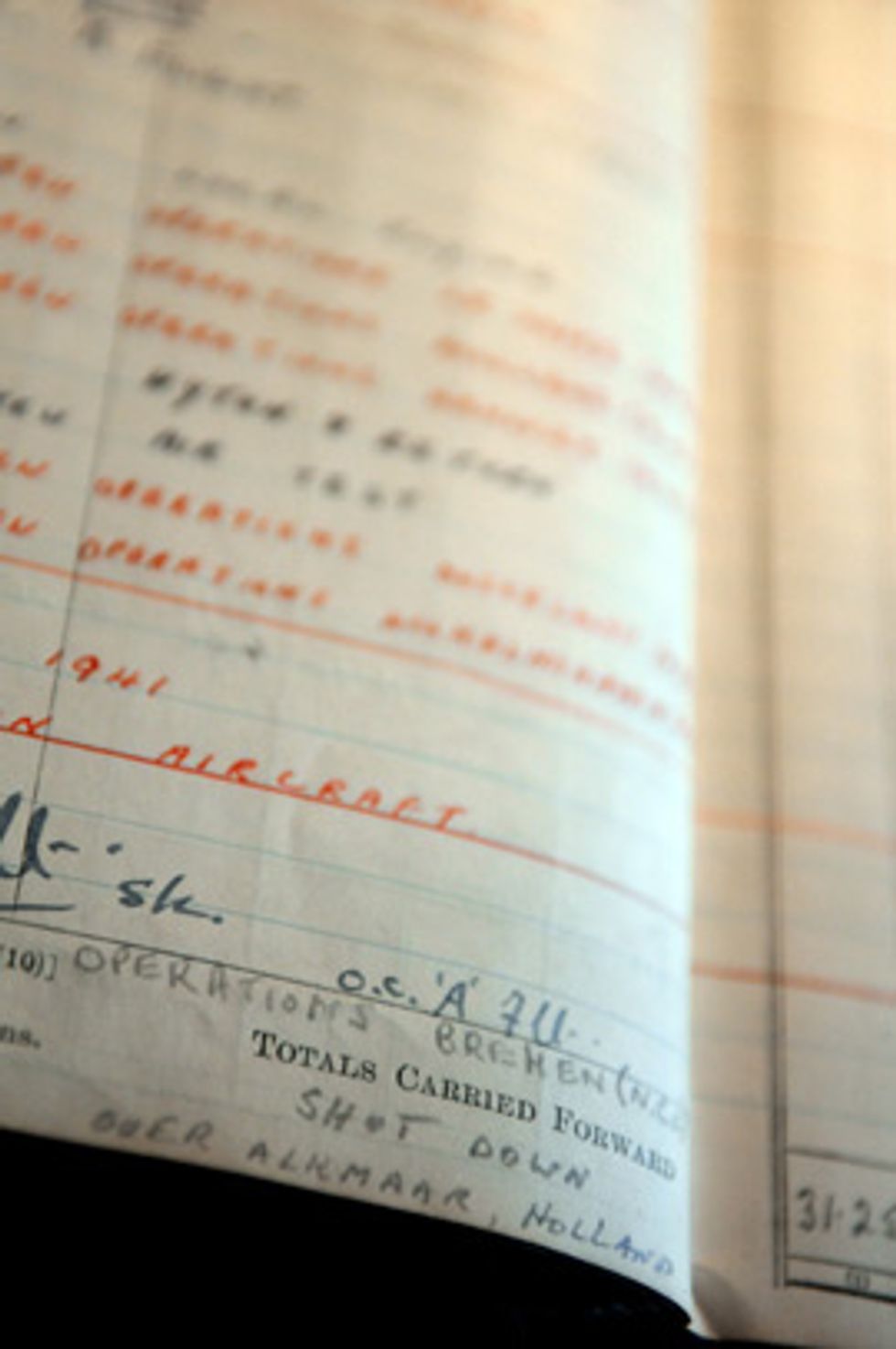 LEFT: The printed program from the April 26, 1942, Strike up the Band performance for the guards at Stalag IX-C. RIGHT: Alf’s pilot’s log indicates he was shot down on March 11, 1941, over Alkmaar, Holland. He was one of two survivors from his seven-man crew, but his leg was wounded badly and subsequently saved by German doctors.