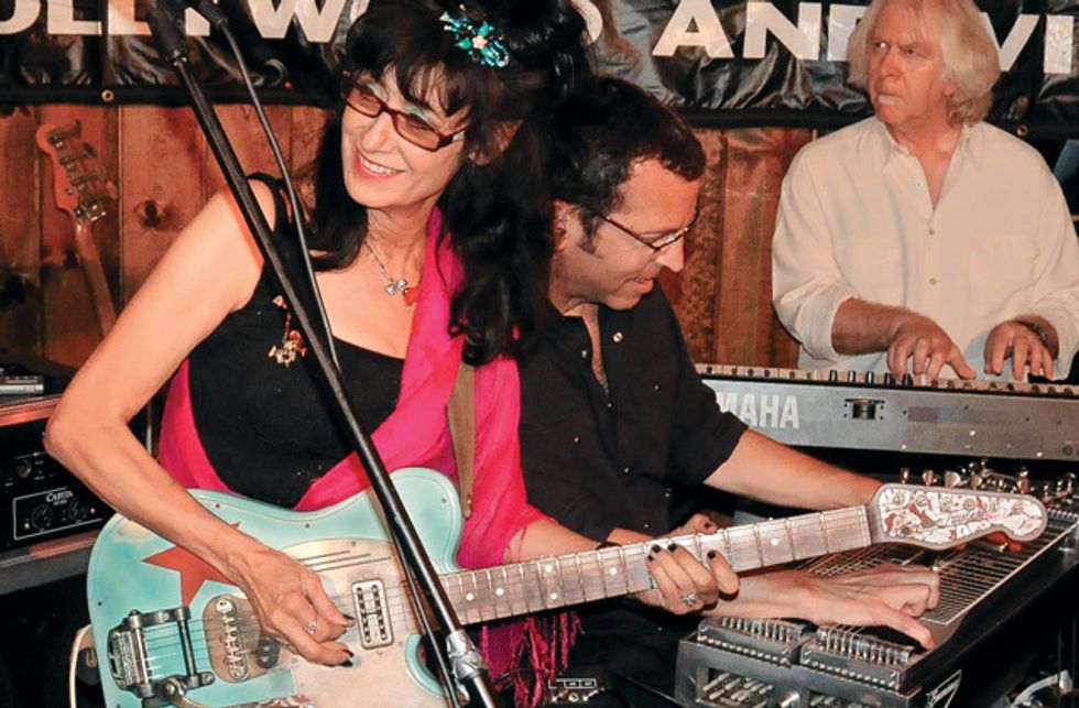 Rosie Flores goes for a huge bend at the 13th fret of her James Trussart SteeltopCaster, which is equipped with a TV Jones neck pickup and a Bigsby vibrato. Photo by James Via Photography