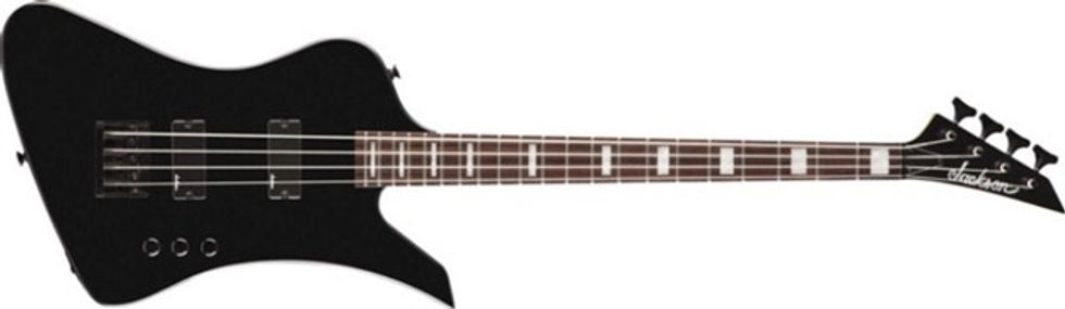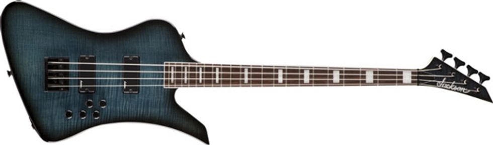 Designed with the serious metal bass player in mind, the JS3 Kelly Bird IV features a basswood body (flame maple top on trans finishes), bolt-on maple neck, bound rosewood fingerboard with 21 frets and block inlays, dual Jackson JS high-output covered pickups, three-band active EQ (bass/mid/high), Jackson high-mass bridge and Jackson tuners. Available in Trans Black and Trans Blue Burst.