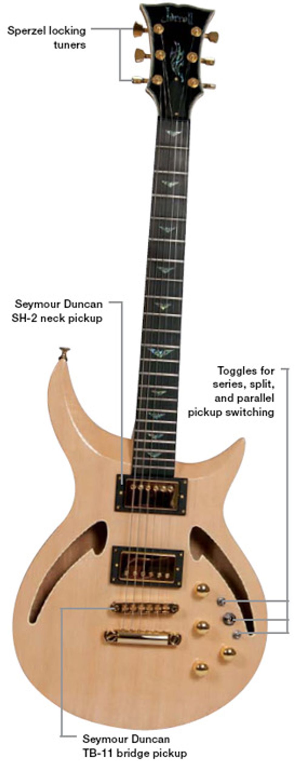 Nothing is more disappointing than playing a great axe with lame pickups. Jarrell eliminates those concerns by putting a Seymour Duncan SH-2 in the neck and a TB-11 in the bridge position. The guitar sports two Volume and two Tone knobs, a standard 3-way switch, and two mini-switches with SSP wiring (series, split, parallel) that offer dozens of combinations and makes playing the JZH-1x nothing short of an adventure.