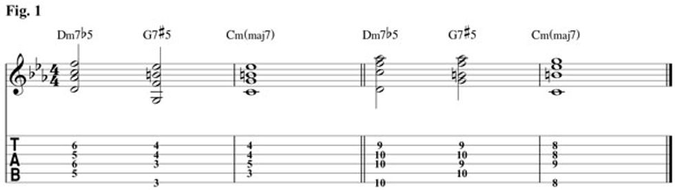 First, let’s define what makes up a IIm-V7-Im progression. Usually the IIm chord is a half-diminished, or minor 7b5 chord (1–b3–b5–b7). Basically, like the name implies, you can think of this as a minor 7 chord with a lowered 5. The V7 chord is always dominant and often sports a #5 (1–3–#5–7). The reason for the #5 is to make sure no chord tones conflict with the melody. Finally, we end with a minor-major 7 chord to not only confirm we are in a minor key, but to give the chord a little more interest than a typical minor 7 chord. Check out Fig. 1 to see two examples of ways to play a simple minor IIm-V7-Im progression.