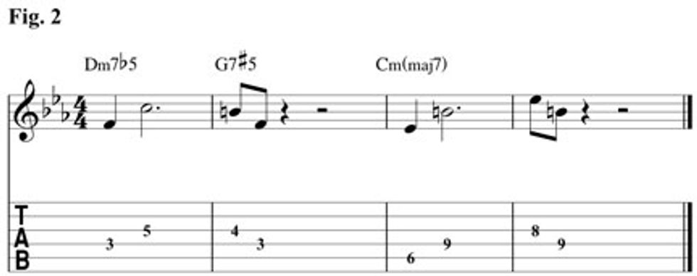 One great technique to play melodically over this progression is to connect the musical dots via the 3rd and 7th of each chord. The 3rd and 7th of a chord is all you need. Think of it as the “heart and lungs” of the chord, and the other notes (even the root) are extra. If we add an interesting rhythm to the notes you can come up with something like you see in Fig. 2. It’s a minimalist sound, but effective.