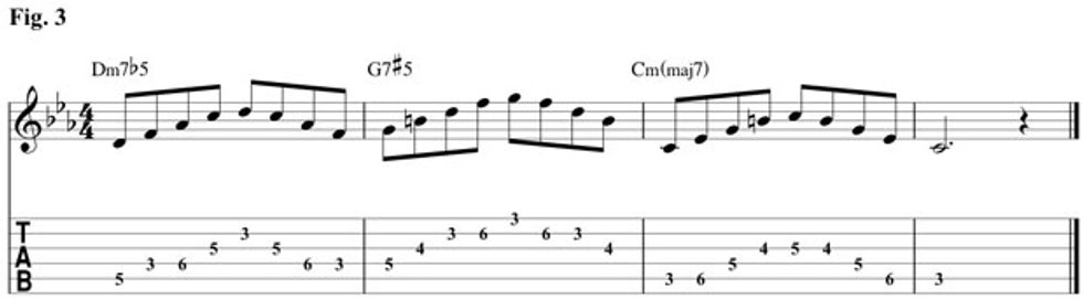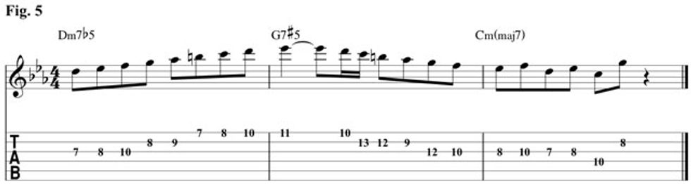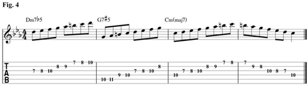 Now let’s get creative with some modes. I’m a big fan of harmonic minor, as two of its modes—Locrian natural 6 on the IIm chord and Mixolydian b9b13 on the V7 chord—sound great when used over this progression. As you can see in Fig. 4, even if you simply run the modes, they work as is. That’s because the chord tones are being emphasized on the downbeats. Think of it as playing the arpeggios, but adding some more notes to “dress it up” a bit.