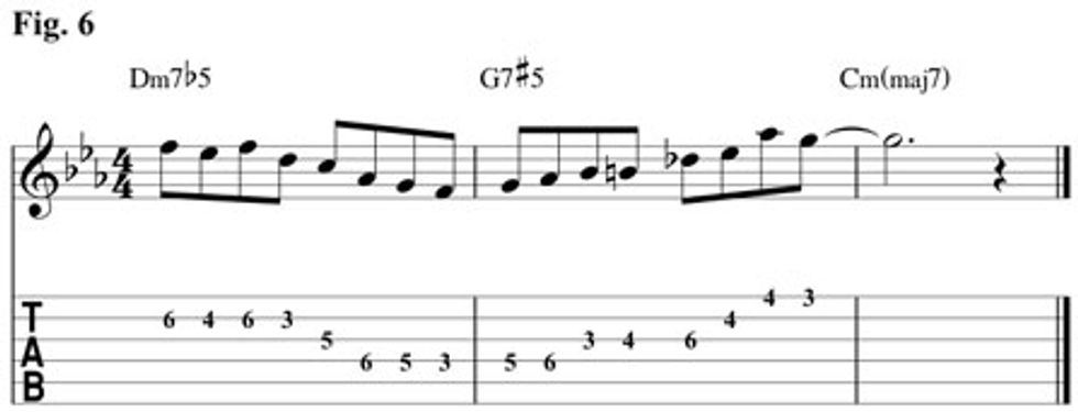 Now let’s look at the melodic minor scale. My favorite technique is to take a super Locrian (aka altered) scale and play it over the V7 chord. One of the beautiful things about melodic minor is its flexibility. This mode of melodic minor has a dominant 7 arpeggio as well as every available tension: b9, #9, b5, #5. (Other modes of melodic minor are great for playing over dominant 7 chords as well, but that’s another lesson for another time.) Fig. 6 is an example of a progression in C minor that uses G super Locrian (Ab Melodic Minor) on the V chord.