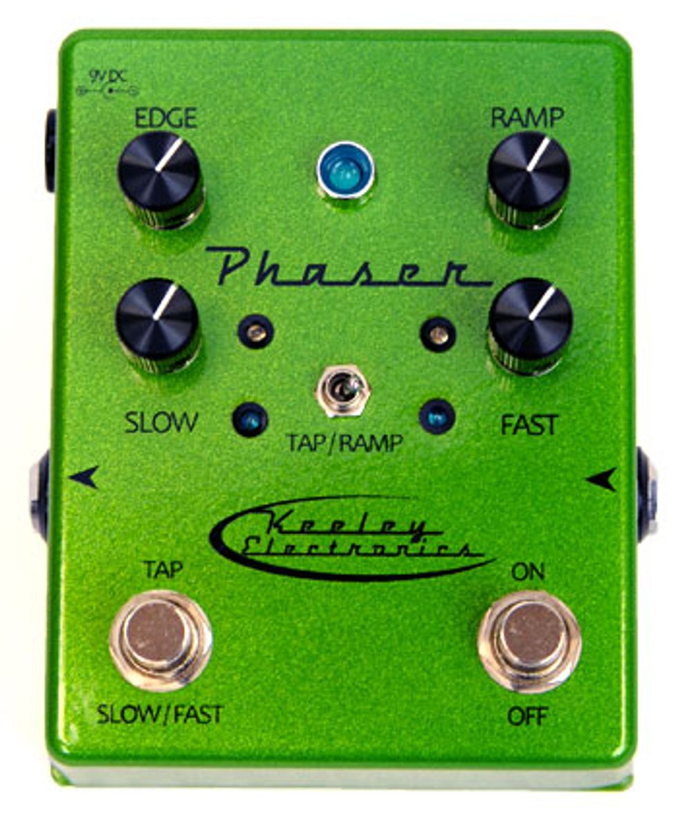 The Keeley Phaser pedal consists of Edge and Ramp knobs as well as Fast and Slow speed knobs. A mini-toggle switch lets you choose between Tap and Ramp modes. Besides an on/off footswitch, there is a footswitch that performs double duty as a Tap Tempo in Tap Mode, and a switch between Slow and Fast in Ramp Mode. The LED lights on the pedal indicate when the pedal is on and what mode you are in, and blinking LEDs indicate the speed of the phaser. In and out jacks and a 9V power supply jack round out the features. The pedal is true bypass, and everything is housed in a case sturdy enough to handle any stomping you may do on it. The Keeley Phaser pedal that I received was a metallic green, but it is also available in other colors such as Translucent Blue, Black Sparkle and Classic Silver. You can also contact Keeley to find out what custom colors they can do for you.