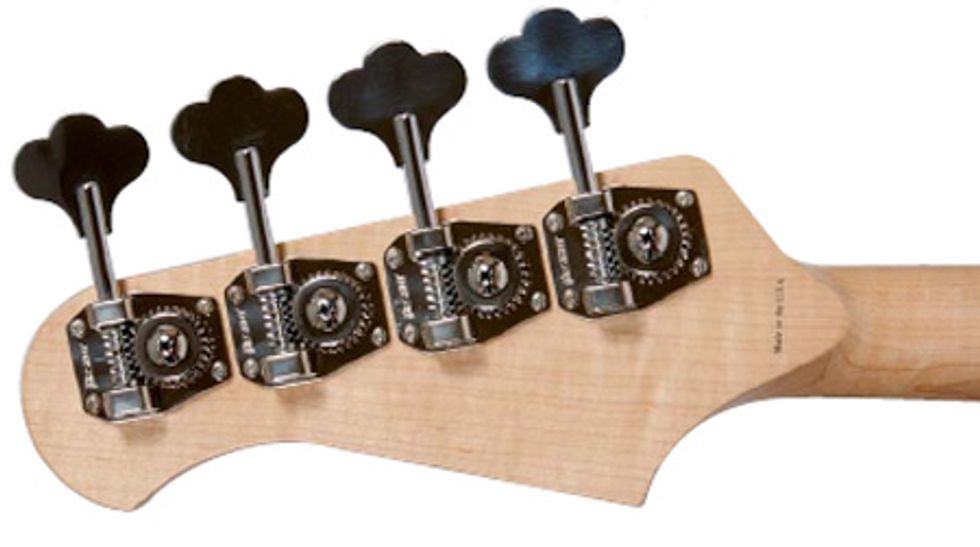 The rosewood neck fit snugly and precisely into its pocket and is adorned with pearloid block inlays, with carefully placed black position dots on the edge of the fretboard. The neck is reinforced by a pair of graphite bars which provide ultra-stability, but I’m also inclined to think they have a lot to do with the bass’s great sustain. Four Hipshot vintage-style long shaft reverse tuners grace the headstock, a top quality choice even if the tuning direction always throws me at first (turn toward you to raise the pitch).