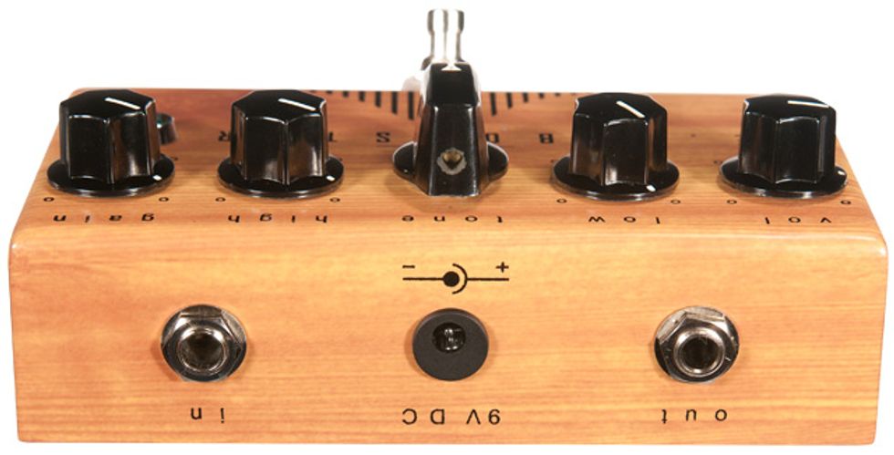 The true-bypass circuit is housed in what looks like a wooden casing, which is really a silk-screened piece of sturdy, weighty bent metal. And you’ll have to use the included 9V wall wart to power the EQ Booster.