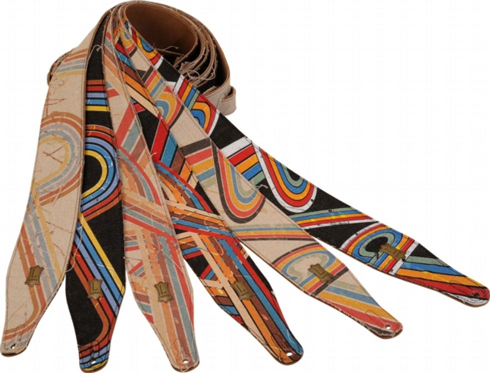 Levy's new hemp and denim guitar straps are 2-1/2” wide and printed with colorful 70's-inspired striped designs. They featured frayed edges and are finished with suede leather backing. Pictured is model M17DH available in six original designs.