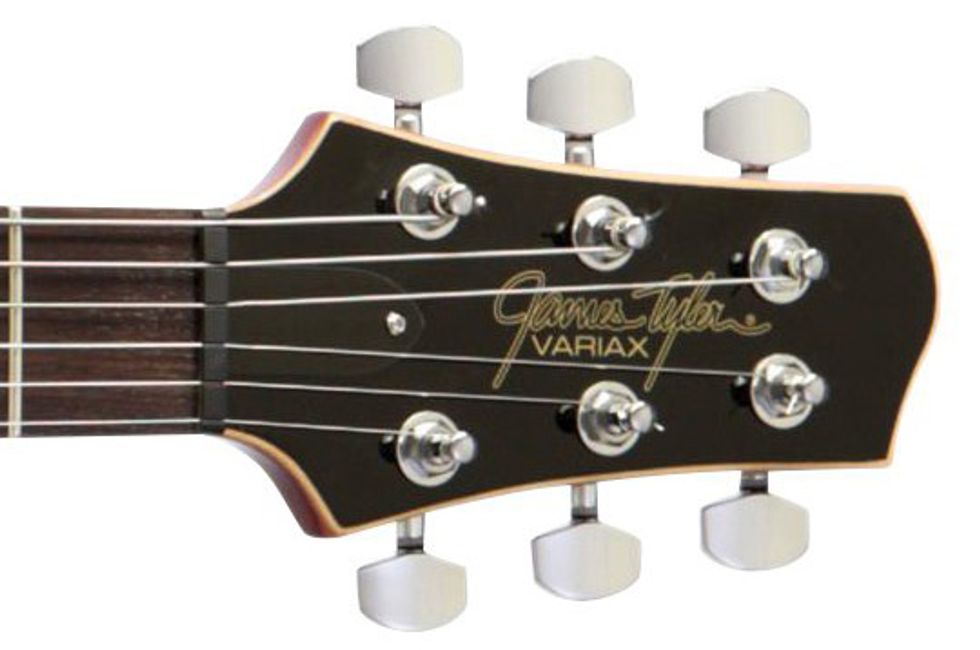 The Variax was originally designed to model a multitude of famous guitars, so traditional magnetic pickups weren’t used on the original models. But in response to demands from players, Line 6 and James Tyler decided to add them into the new Variax models, so players can switch between magnetic pickups and the Variax’s emulated models. On the JTV-59, two PAF-style humbuckers are controlled with a traditional three-way switching system and volume and tone knobs. The other two knobs on the body are for activating the Variax’s modeling circuits and controlling the model and tuning models. Also, when in Variax mode, the 3-way, volume and tone knobs are also encoders that control parameters in the modeled guitar. There’s also a custom-designed Tyler stop tail bridge and saddle combo, which houses an L.R. Baggs Radiance Hex piezo pickup system for the Variax modeling circuits.