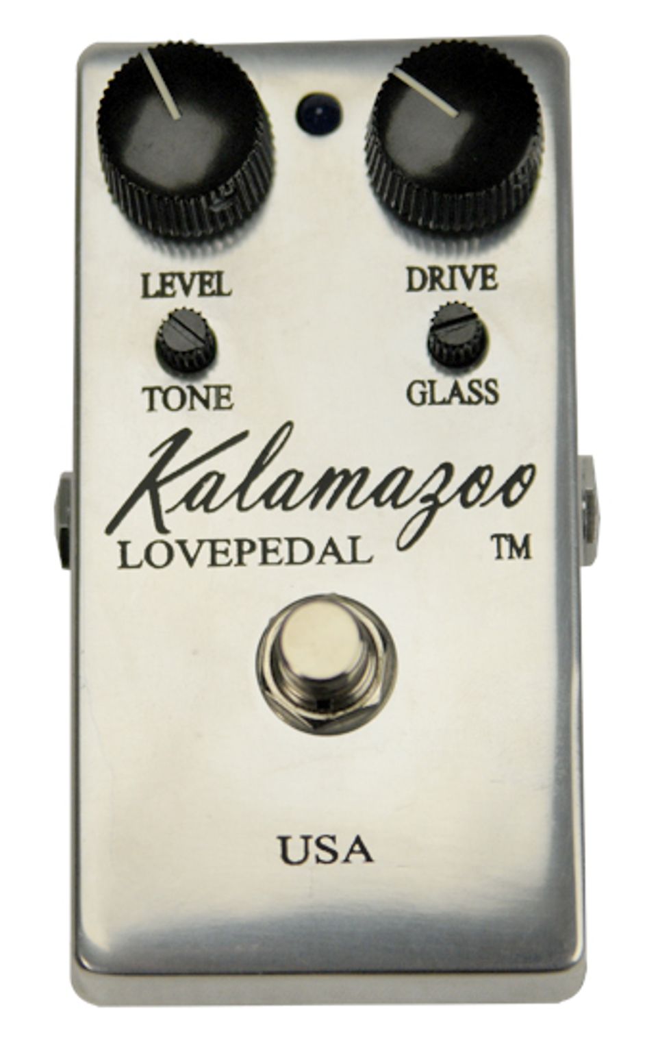 Admittedly I cheated a bit and checked out the fantastic clips on the Lovepedal site before the Kalamazoo arrived, so plugging in there was a relatively high level of expectation already set. I began with the Les Paul and Marshall dialed in to a slightly dirty clean tone and set the pedal controls midway. Aside from the boost in volume, the first thing that struck me is how the Kalamazoo added its own signature while leaving the Les Paul/Marshall sound distinguishable. This setting was slightly darker than I anticipated, so I dialed back the Tone to fully counterclockwise, which opened up the sound significantly. Hearing how wide the sweep was, I decided to crank the Glass control, which added a good deal of bite without sounding brittle or harsh. This is where the beauty of the Glass control comes in. Most pedals don’t retain bass the same way when you crank up the treble control, and I appreciate the fact that this didn’t erase the “knock” I so love about Marshalls. Bringing the Drive up to higher levels increased sustain and harmonics while slightly compressing the sound more. It made everything denser and more complex, yet I could still hear every note clearly in chords—no small feat. The real treat came when I dimed the Level and pulled the Drive back to around 11:00. This setting became my favorite because it pushed the front end of the amp beautifully to make notes explosive and percussive. Surprisingly, even in the most extreme settings there was a negligible amount of noise added to the overall hum of the Marshall. In fact, it was downright quiet by any pedal standards. Rolling off the guitar’s volume knob didn’t totally clean up the sound, but it didn’t matter because the tone was killer even if there was some residual grit leftover.