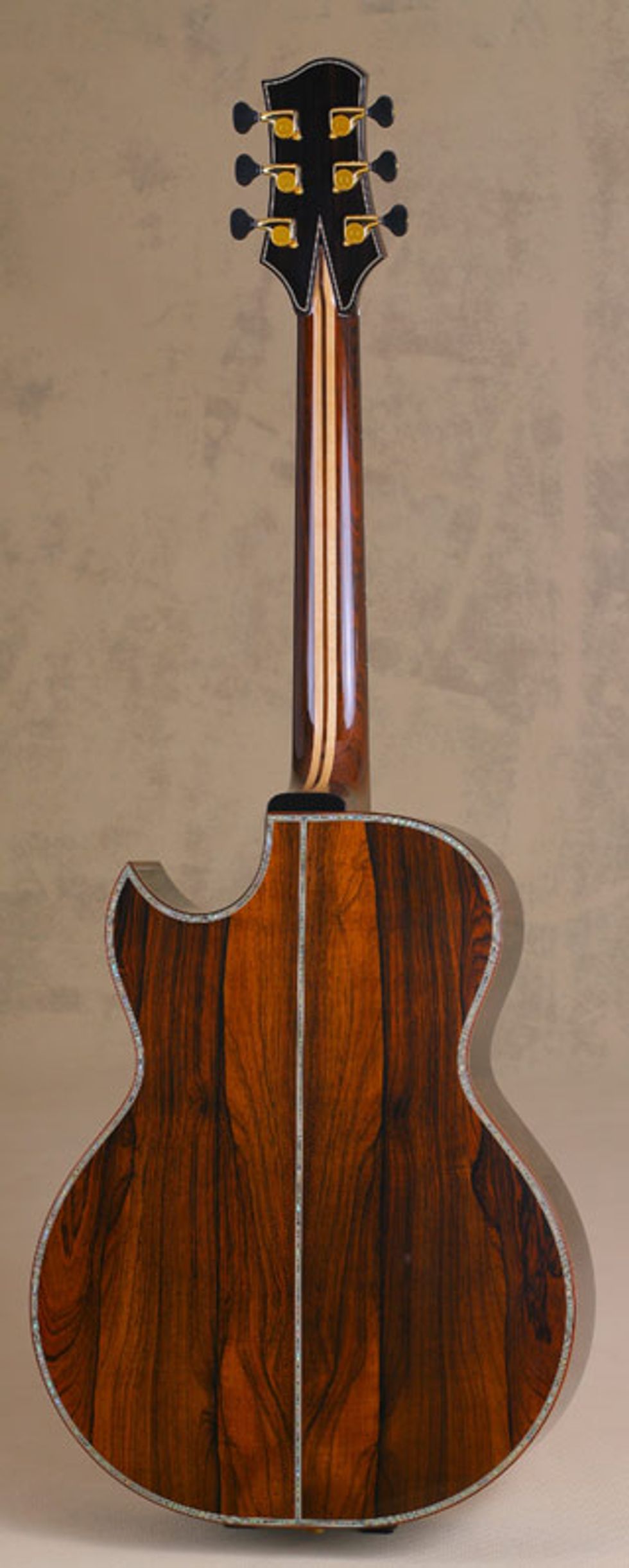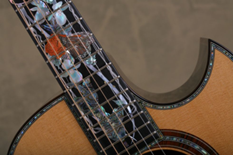 The guitar pictured here is one of two Anniversary Models Olson produced to celebrate his 30th year of guitar making. Identical except for one model having a cutaway, the guitars have cedar tops and “special reserve” Brazilian rosewood backs and sides. They feature Brazilian and paua shell rosettes, old growth Brazilian rosewood neck laminates and WBW purfling. These Anniversary Models also feature fossilized ivory nuts, saddles and bridge pins. This model features special fingerboard inlays by Larry Robinson. It sold for $35,000.