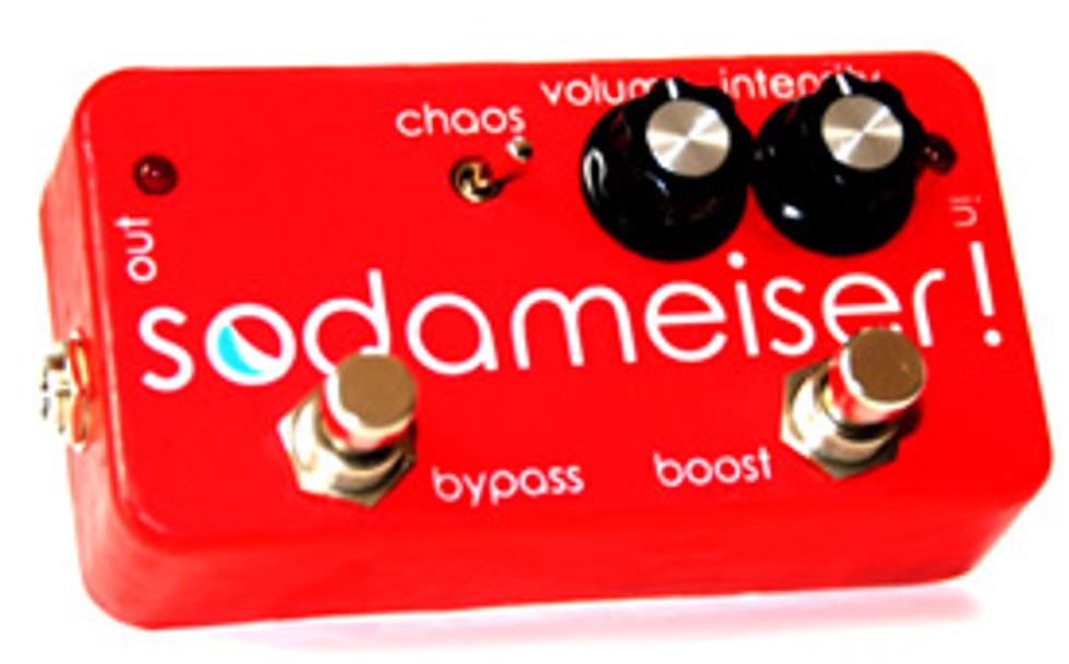 The Soda-Meiser appears to be a basic fuzz pedal, but what it may lack in features it makes up for in all-out fuzz heaven. In heavy competition with the infamous Big Muff, this pedal is a lot more fun to play, with better harmonics to boot. The pedal layout is simple: you get two footswitches for Bypass and Boost, a Volume knob, Intensity knob, Chaos switch (it means what it says), and two big, bright LEDs, for Bypass and Boost. My favorite setting on this pedal was with the Intensity set at 2 o’clock without the boost; volume was adjusted according to the room. The intensity knob adjusts the amount of signal going to the fuzz circuit, similar to the sustain knob on a Big Muff. The Soda-Meiser provides amazing sustain— chords just droned on forever. The pedal also has a smooth bass response.