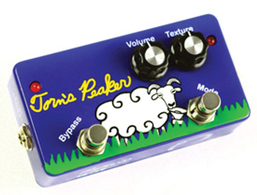 The Torn’s Peaker, another great play on words, is also a fuzz pedal, which is grittier overall compared to the Soda-Meiser. By design, the bass response isn’t very smooth; low chords tend to break up, but the midrange provides the clarity missing in the Soda-Meiser. It provides the same amount of features, minus the chaos switch—so you get Volume and Texture knobs, a Bypass switch and Mode switch, plus two huge LEDs to let you know when the circuits are active. The Texture knob actually acts more as a fuzz shaper than a Tone knob. Extreme right offers smooth harmonic textures, while the extreme left offers a fuzzed-out crunchy sound. The middle is fairly standard fuzz that’s still a bit on the crunchy side.