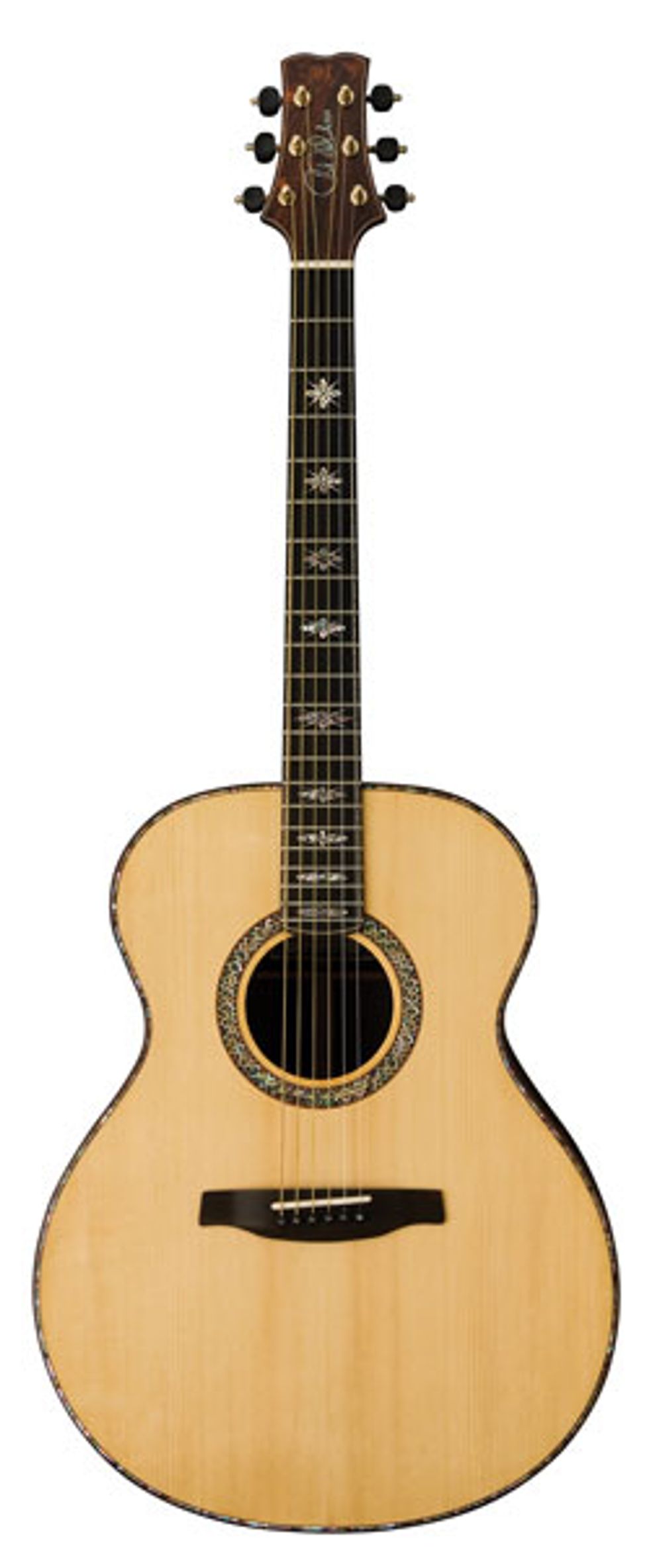 Appointments and Features We got a base model for review, with pickup system installed. The Tonare Grand is a comfortable 16" at the widest point. This top is European spruce, and back and sides are cocobolo with exquisite cocobolo veneer bindings and purflings, finished with the proprietary PRS shatter-hard all Nitro finish. The 1-3/4" fingerboard, inlayed with the familiar PRS bird figures, is cocobolo as well, with identical binding all the way around, which flows onto the cocobolo-faced headstock to form a complete outline. The rosette is charming and simple: three alternating rings of cocobolo and abalone. Side dots are elegant tiny circles that look like copper or brass, and this is my only complaint: in anything but direct light you can barely see the side dots (some of us with agingeye- syndrome had to put on the special glasses to see them at all). The neck is very much like their electrics—chunky, comfortable, satiny, and ergonomic enough to play for hours. Barre chords are almost effortless, easier than almost any acoustic I’ve ever played. The lovely Keith Robson hand-machined tuners look like they could be gears in an artillery launcher. They’re very sensitive; a little tweak goes a long way.