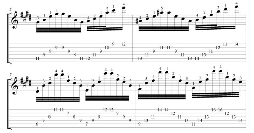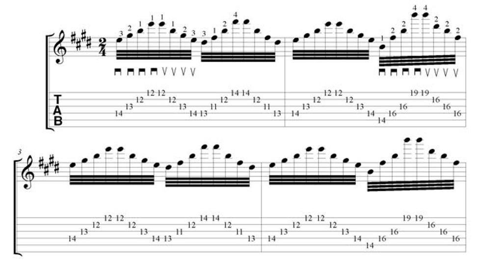 To play this piece I use sweep picking for the whole thing, which is a great workout if you want to develop your sweep picking technique.  I listed the right hand picking pattern on the notation. For this first section, there are basically two different types of picking patterns.  The first one is when you are not skipping a string and you are just playing the notes in a row, the other one you are skipping the B string when you are ascending.  Be sure to take it slow and gradually build up speed and feel free to ask me any questions you may have.