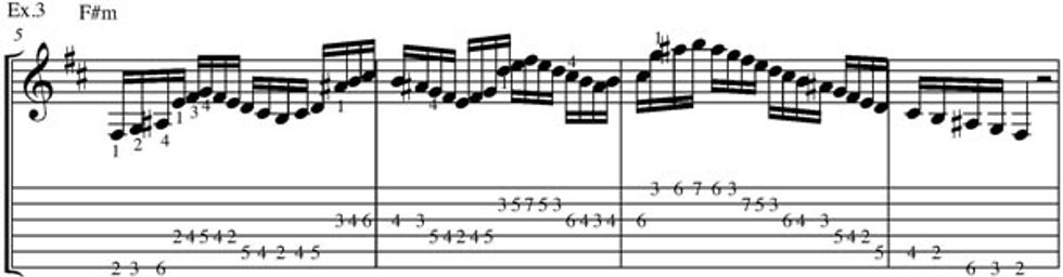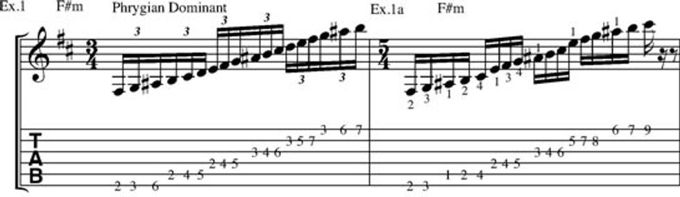 | Ex.1 This is just a basic 3-note-per-string pattern for the Phrygian Dominant scale in the key of F#. The notes are F#, G, A#, B, C#, D, E. The key is to play this scale everywhere on the neck in all keys and make up your own patterns—don't stick to one shape. | Ex.1a Here is a cool pattern I came up with that brings out the exotic flavor of this scale. Basically, it is just a six note